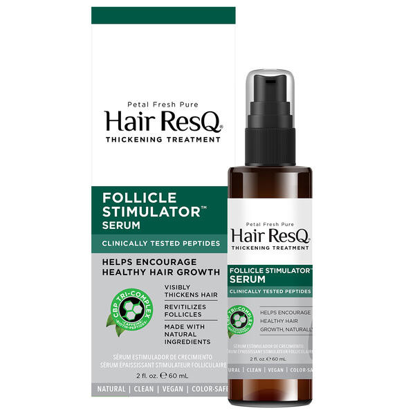 Hair ResQ Thickening Treatment Follicle Stimulator Serum for thinning hair is uniquely formulated with CBP Tri-Complex, a proprietary blend of plant-based Peptides, Biotin, and Caffeine. Clinically tested peptides target DHT, which causes the onset of hair loss, while Biotin and Caffeine promote circulation to nourish hair follicles, amplify texture, and enrich the hair shaft, giving the appearance of thicker, fuller hair with continued use.